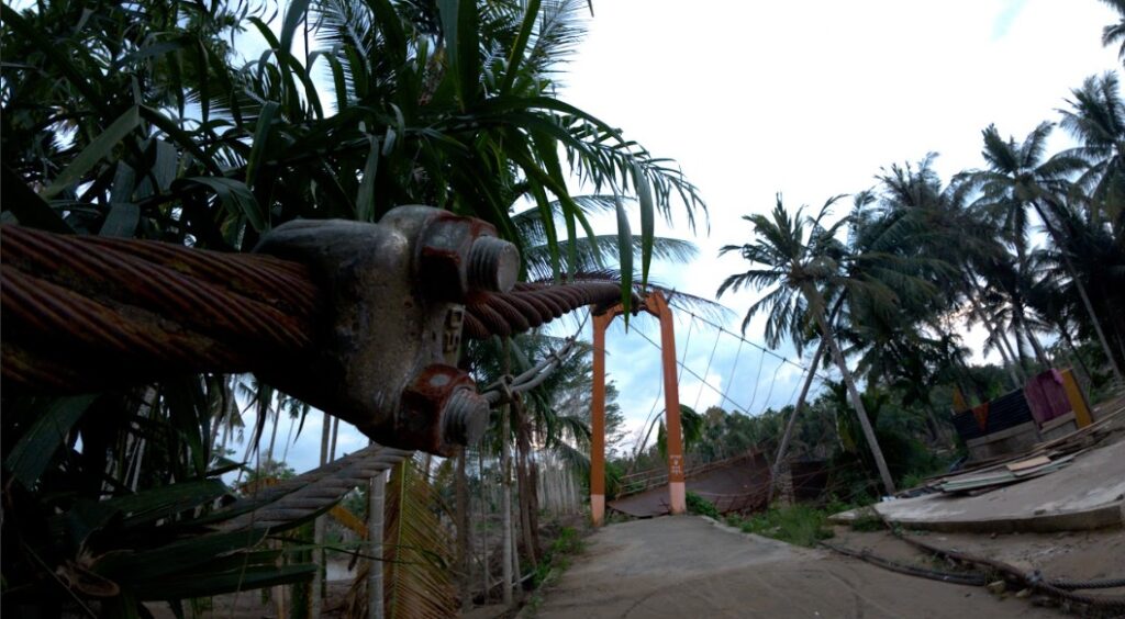 Kondisi jembatan gantung yang rusak parah di Desa Rambong Payong, Kec. Sawang, Aceh Utara setelah diamuk banjir bandang.