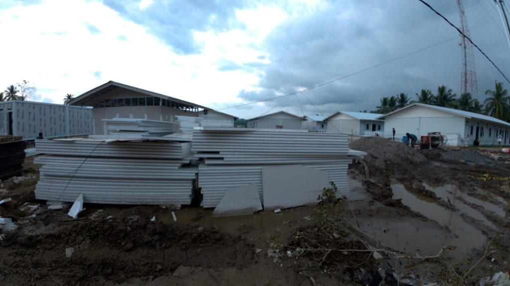 Proses pembangunan hunian sementara di Desa Paya Rabo Lhok, Sawang, Aceh Utara. Foto direkam pada 14 Februari 2026.