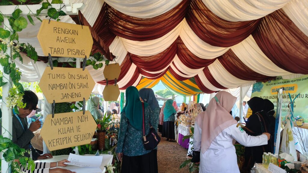 Misalnya, kata Desy, penggunaan kemasan-kemasan yang ramah lingkungan. Seperti yang ada di stan-stan tersebut, air tebu dan air nira dihidangkan dalam “tumbler” dari bambu; bubur pedas dalam wadah batok kelapa muda; sayur rebus dalam wadah “mangkok” daun pisang; hingga telur asin yang dibungkus dengan ôn keureusông; sie reuboh dalam wadah tembikar; dan aneka umbi-umbian menggoda selera di atas nyiru berbahan batang bemban (bak bili).