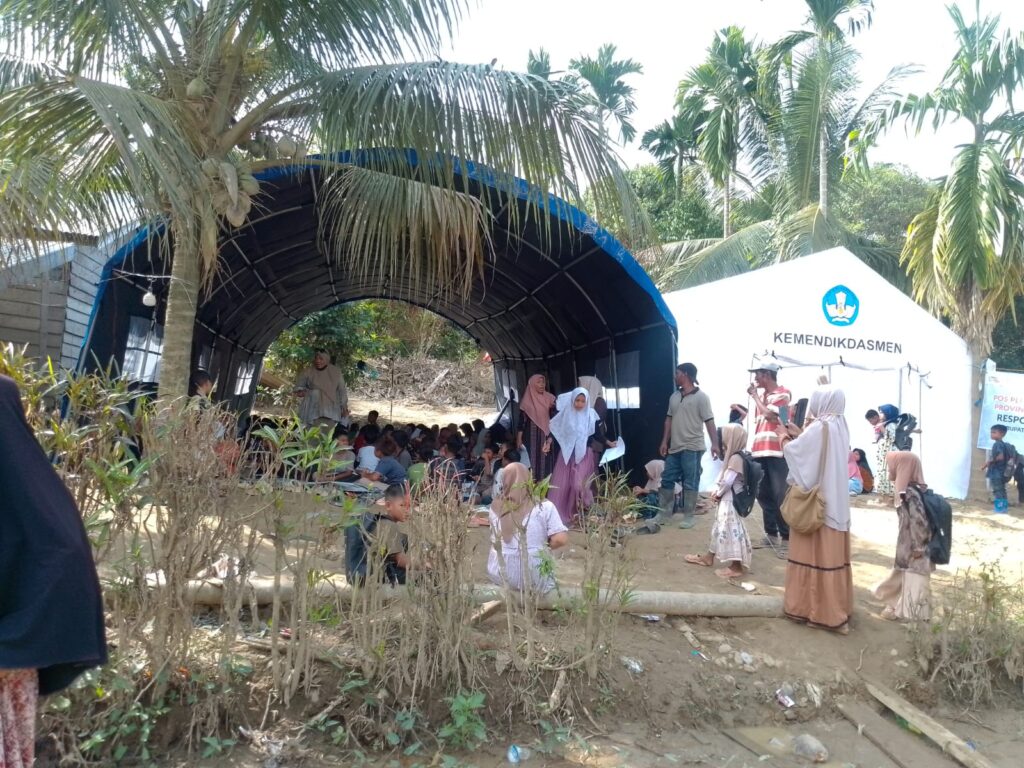 Kami juga mengunjungi sekolah darurat yang didirikan di bawah tenda. Puluhan siswa-siswi usia sekolah dasar duduk di atas tikar plastik, khusyuk mendengarkan sang guru yang berdiri di depan. Semangat dan optimisme mereka untuk tetap menimba ilmu di tengah situasi darurat pascabencana ini membuat mata spontan basah.